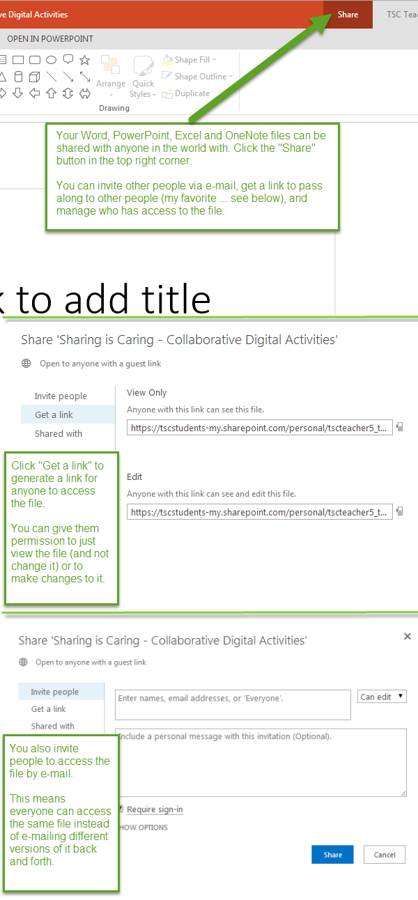 Shared PowerPoints can be a quick and easy way to have students create something and share it with the class. Create a PowerPoint with a slide for each student (maybe with an additional slide as a title slide at the beginning). Share it with the class (use the “Share” button, then “Get a link” and create a link for “Edit — Anyone with this link can see and edit this file.”