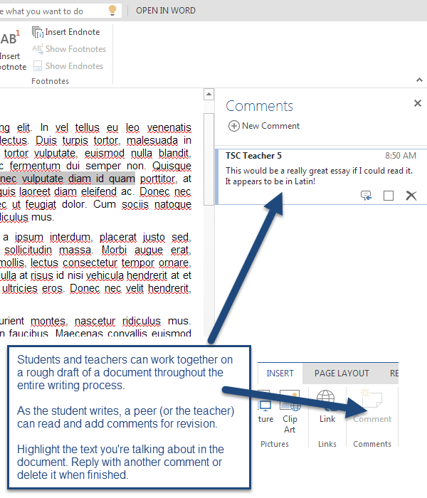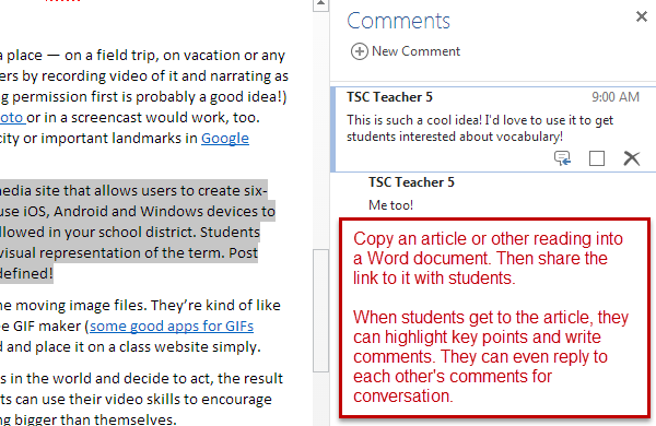 This puts a different spin on online reading discussions. Instead of discussing a reading, the teacher can post a topic of discussion or some questions for students to discuss in a Word document. Students can write their answers in the document (either as actual text in the document or as comments). They can post links to articles to support their ideas and images to illustrate them. The document serves as a record for their digital conversation and can be posted on a class website or in a folder shared with the class.
