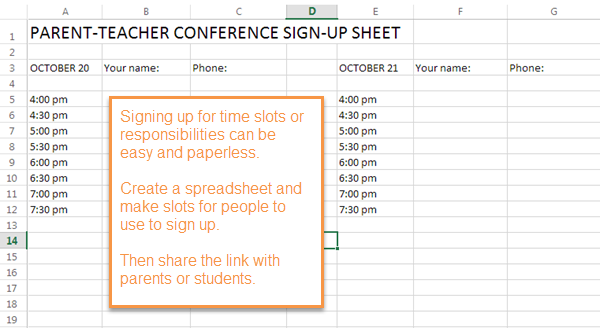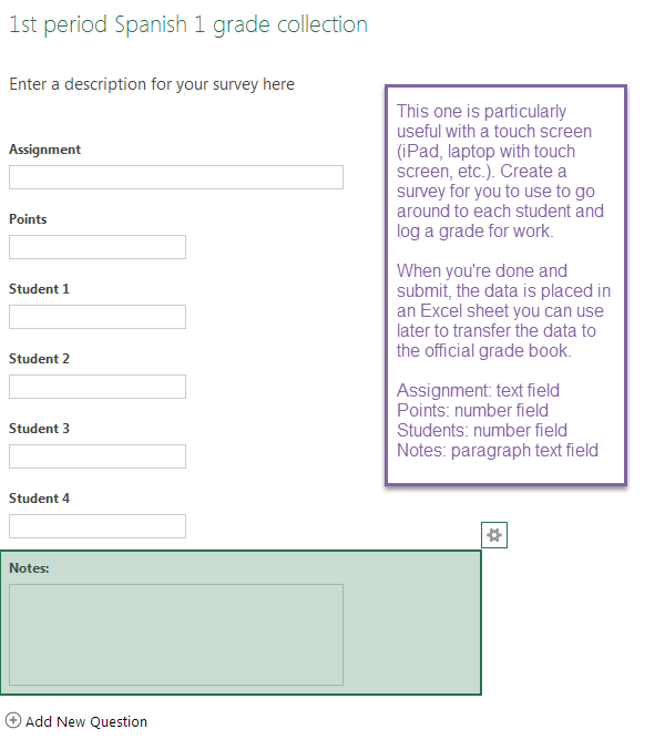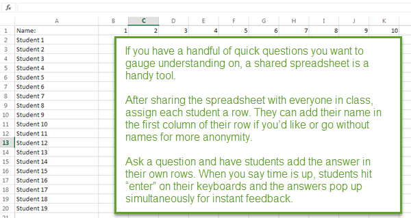 Homework can be turned in through Excel surveys as well. Create a survey (make sure to use “Name:” as the first question!) and share it with students. Instead of turning in paper assignments, all of their answers will be gathered in an Excel spreadsheet after they take the survey.