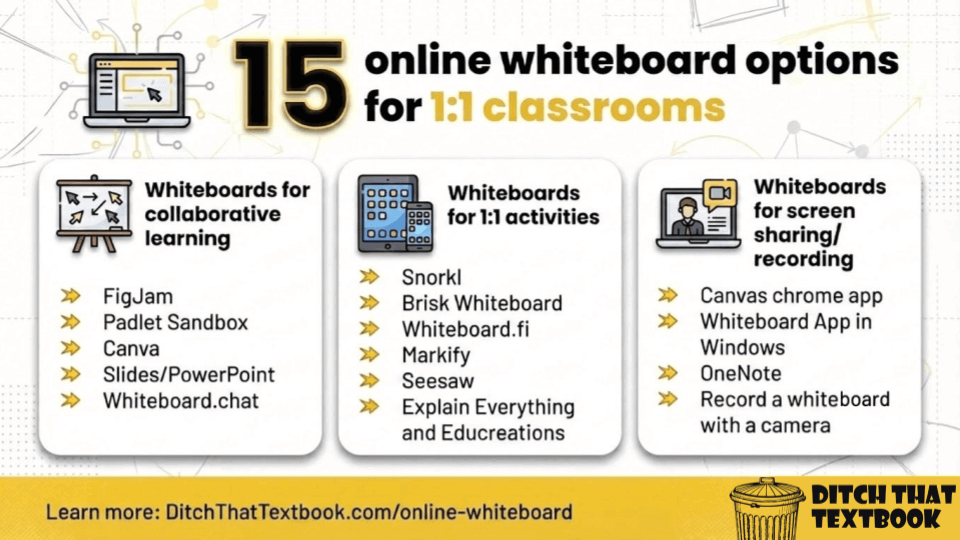 Whiteboards are a staple of face-to-face classrooms. In a 1:1 classroom or during remote learning, you can still recreate that experience. Here are 15 ideas (and templates!) to get you started.